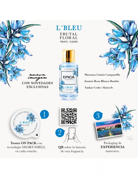 L´Bleu, un eau de parfum floral frutal. Comienza con una refinada salida fresca y cítrica de la manzana y el limón, se funde delicadamente en un blend floral de jazmines y rosas y concluye en un final amaderado de ámbar y cedro, dejando una estela de frescura y elegancia.