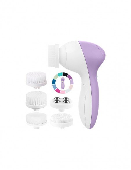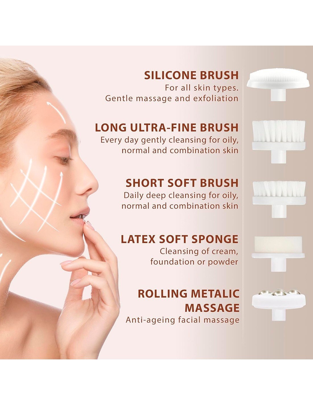 El kit de limpieza facial incluye: 7 cabezales de cepillo reemplazables, un cepillo largo ultrafino para una limpieza suave diaria, cabezal de masaje rodante, esponja de maquillaje, cepillo suave corto, piedra pómez, esponja suave de látex y un accesorio de pulido crudo para una eliminación dura de la piel