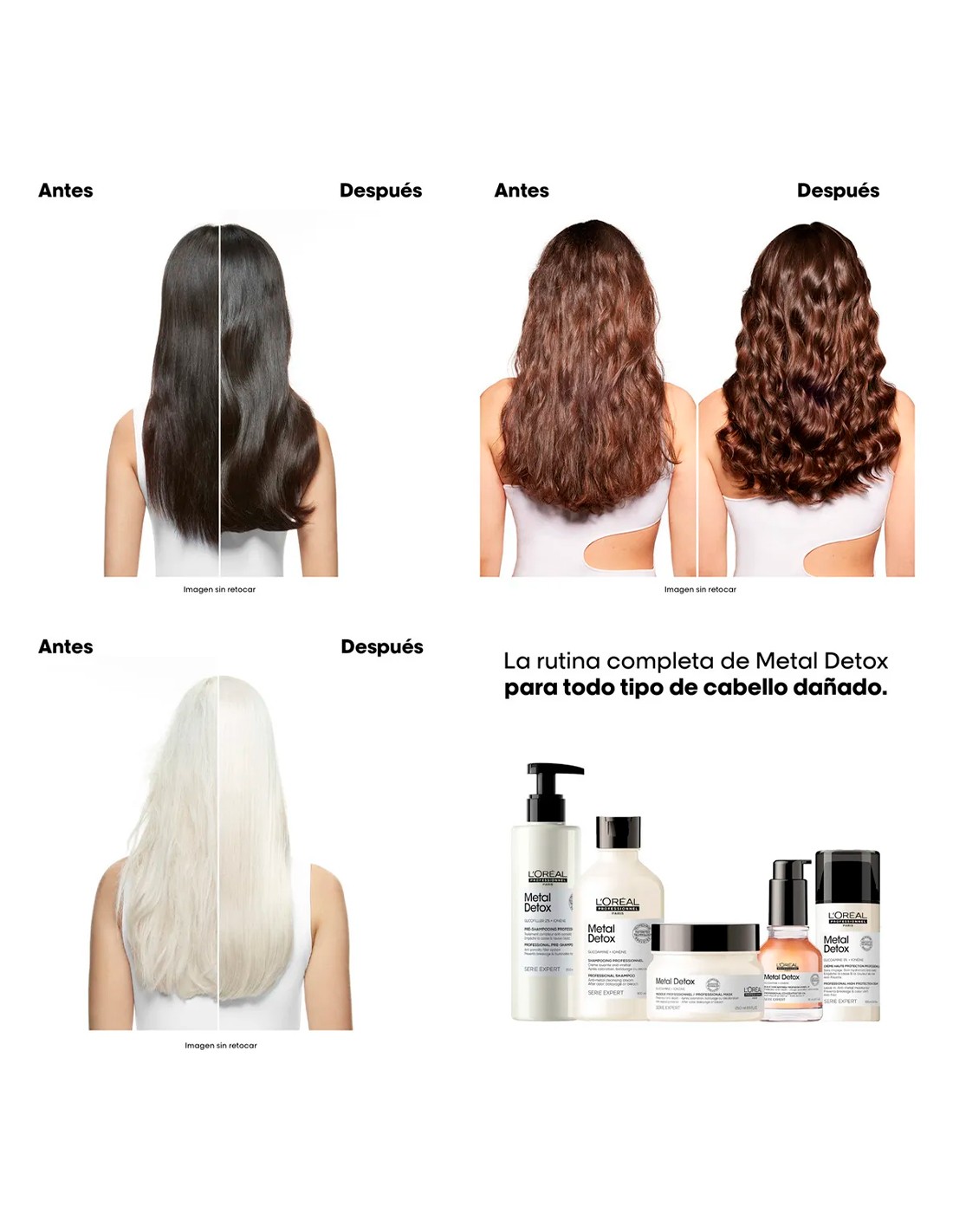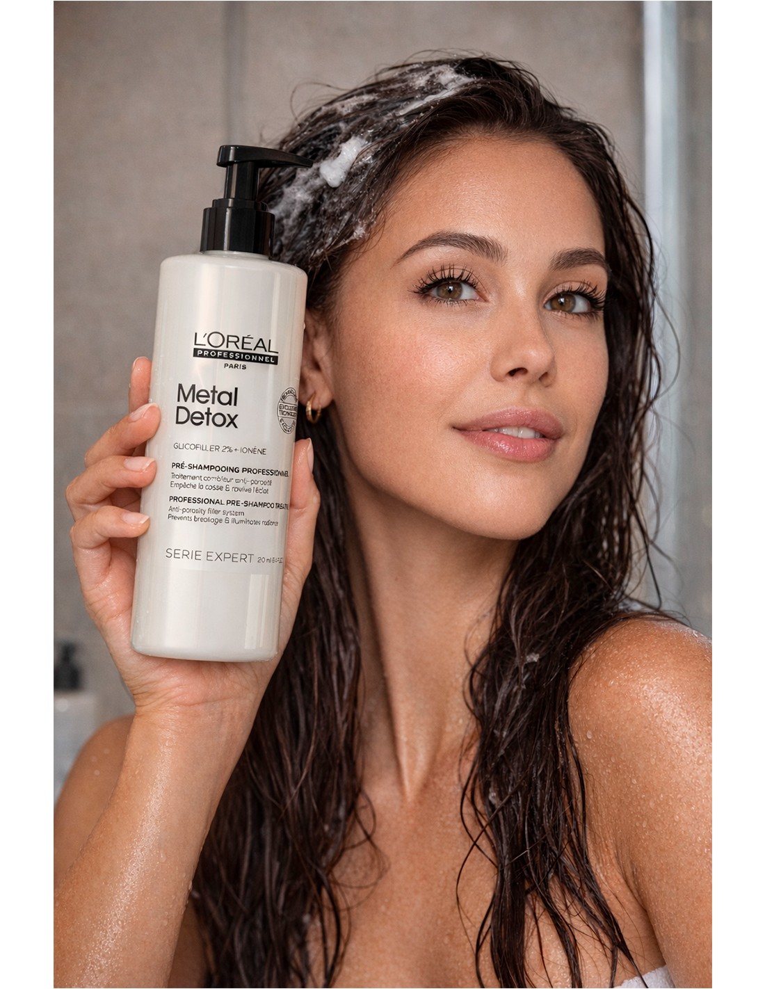 Lo que hace es eliminar los metales que se acumulan dentro de la fibra capilar —sí, esos que vienen del agua y que hacen que el pelo se apague, se rompa o que el color se desgaste rápido.