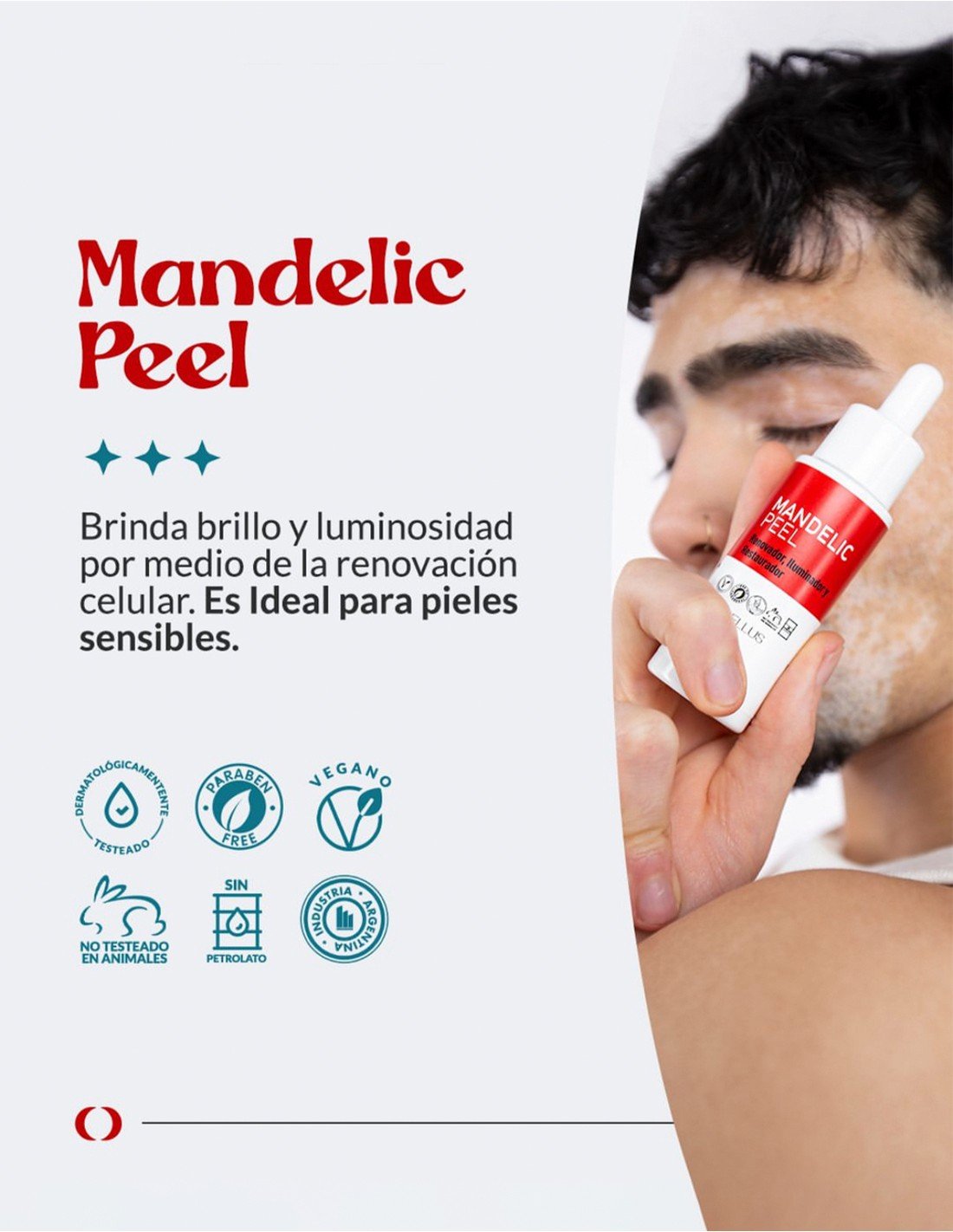 Nuestra formula innovadora contiene Ácido Mandélico, un alpha-hidroxiacido que permite una exfoliación química suave, ideal para las pieles sensibles.